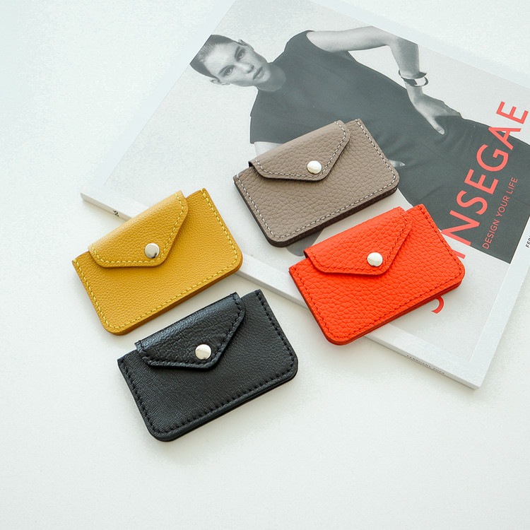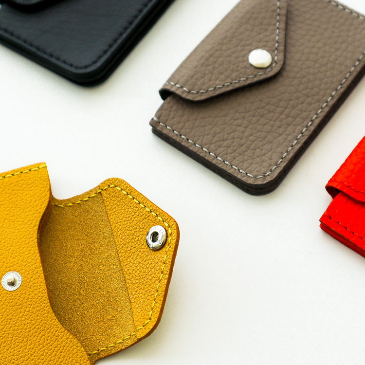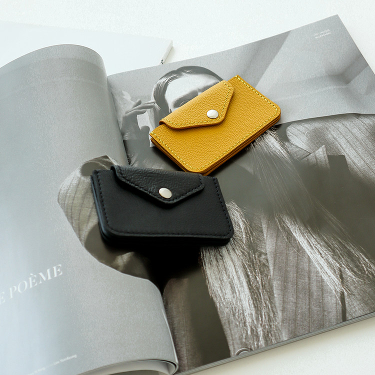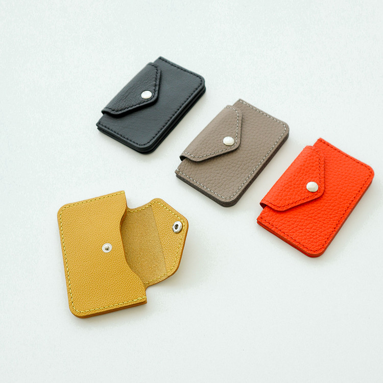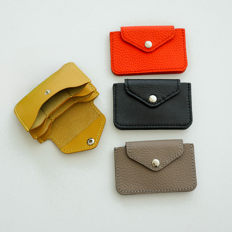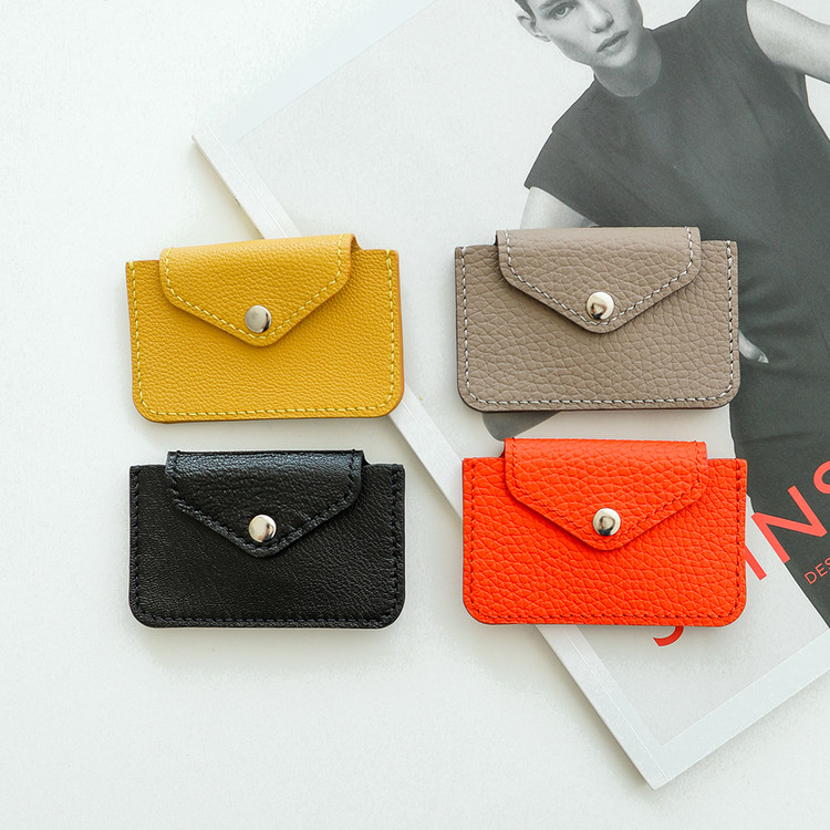 오렌지 블랙 머스타드 그레이 색상이 선택 가능하며 넉넉한 수납을 할 수 있는 핸드메이드 오플 소가죽 카드 지갑